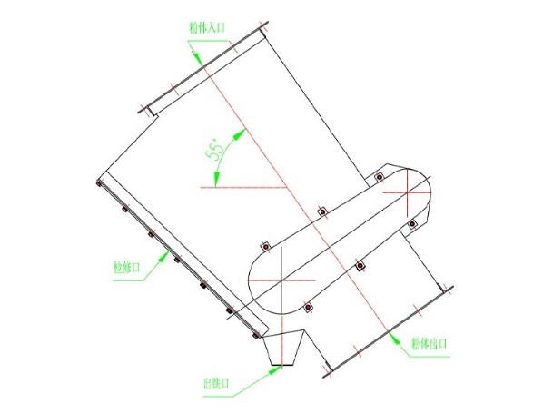 閉路系統(tǒng)出磨、回料管道除鐵,熟料預粉碎后除鐵、水泥包裝機前除鐵,礦渣除鐵等,安裝角度50°-70°,物料溫度≤120℃。