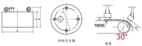 | 型號(hào) | 適應(yīng)帶寬mm | 額定吊高h(yuǎn) mm | 磁場(chǎng)強(qiáng)度mT | 物料厚度≤mm | 勵(lì)磁功率≤kw | 適應(yīng)帶速≤m/s | 重量kg | 外形尺寸mm | |||