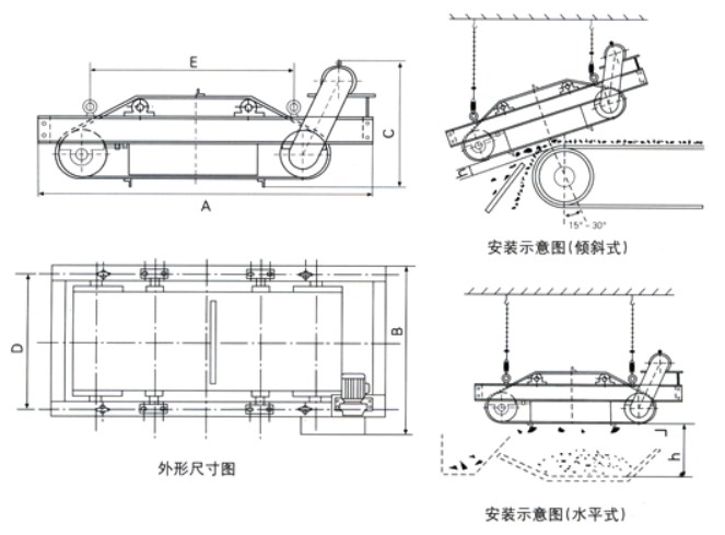 項(xiàng)目 | 適應(yīng)帶寬mm | 額定吊高h(yuǎn) mm | 磁場強(qiáng)度mT | 物料厚度≤mm | 勵(lì)磁功率≤kw | 驅(qū)動(dòng)功率≤kw | 適應(yīng)帶速≤m/s | 重量kg | 外形尺寸mm | ||||